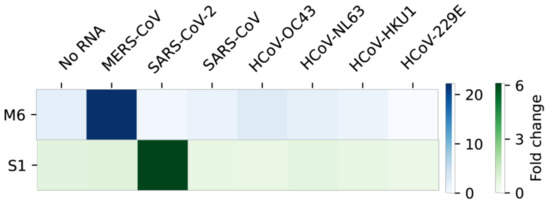 Specificity of the modified RT-LAMP-coupled toehold reaction against other coronaviruses. Sensor M6 for MERS-CoV and sensor S1 for SARS-CoV-2 were tested with several coronaviral RNAs. For the specificity test, 12,000 copies of target RNA were used for RT-LAMP. Fold change was calculated by taking absorbance values at 60 min using a 60-min RT-LAMP reaction product. Colors in the heatmap indicate the mean value (n = 3) of fold changes of the toehold reaction and the scales are given on the right.