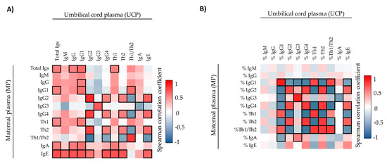 Correlations between the Ig concentrations (A) and the Ig relative percentages (B) present in umbilical cord plasma and maternal plasma (n = 17). The Spearman correlation coefficient is represented in the heat map following the color in the legend. Bold frames represent correlations with statistical significance (p < 0.05). MP, maternal plasma; UCP, umbilical cord plasma. IgG1, IgG2, and IgG3 (Igs associated with a Th1 response); IgG4 (Ig associated with a Th2 response) [30,31].