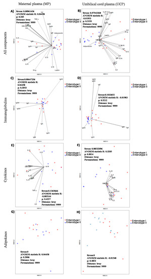 Non-metric multi-dimensional scaling (NMDS) representations of the immune components studied with regard to maternal enterotype in maternal plasma (A,C,E,G) and umbilical cord plasma (B,D,F,H) showing all components (A,B): Igs alone (C,D), CKs alone (E,F), and adipokines alone (G,H).