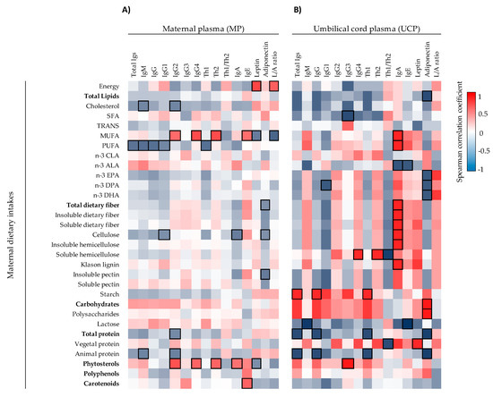 Correlations between Ig and adipokine composition present in MP (A) (n = 13) and UCP (B) (n = 6) with the maternal dietary intakes. The Spearman correlation coefficient is represented in the heat map following the color in the legend. Bold frames represent correlations with statistical significance (p < 0.05). MP, maternal plasma; UCP, umbilical cord plasma; L/A ratio, Leptin/Adiponectin ratio. IgG1, IgG2 and IgG3 (Igs associated with Th1 response); IgG4 (Ig associated with Th2 response) [30,31].
