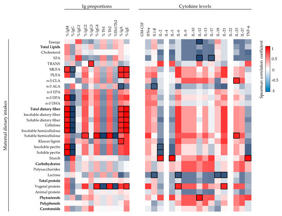 The influence of maternal diet on the immunological profile of the UCP (Figure 5B and Figure 6) was more remarkable than that of the MP. Different components of the maternal diet correlated positively with IgA levels, such as MUFA, PUFA, and many fiber-type components (cellulose, hemicellulose, lignin, and both soluble and insoluble fiber) (p < 0.05). In addition, the total and animal protein intake seemed to be associated with lower levels of Ig, particularly those of the Th1 response, whereas starch consumption led to the opposite effect (Figure 5B). Overall, both hemicellulose and vegetal protein consumption during gestation correlated with a lower Th1/Th2 ratio (p < 0.05). Moreover, when UCP Igs relative proportions were evaluated, the influence of the intake of MUFA and dietary fiber showed a correlation with lower IgG levels and higher levels of IgA, IgE, and IgM (p < 0.05, Figure 6). Stronger associations between CKs and maternal diet were found in UCP with respect to MP (Figure 6). For example, there are significant positive associations between vegetal protein and IL-6, starch with IL-2 and IL-5, phytosterols with IL-12 and CLA, and hemicellulose with IL-23. On the contrary, the maternal intake of SFA was associated negatively to the UCP levels of IL-12 and IL-17 (p < 0.05). Finally, the intake of vegetal protein influenced positively the UCP leptin concentration, whereas animal protein, EPA, DPA, and DHA present in the maternal diet were associated negatively with UCP adiponectin concentration (p < 0.05) (Figure 5B).