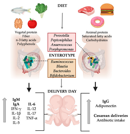 In summary, it is suggested that a diet rich in fiber, vegetable protein, and n-3 fatty acids with a predominant enterotype in the Ruminococcaceae family (e.g., Ruminococcus), Lachnospiraceae family (e.g., Blautia), and the genus Bacteroides and Bifidobacterium promotes higher levels of IgA, IgM, and pro-inflammatory cytokines on the delivery day. However, a diet rich in animal protein, carbohydrates, and SFA (with enterotype enriched by the genera Prevotella, Peptoniphilus, Anaerococcus, and Porphyromonas) generates higher levels of IgG and fewer pro-inflammatory CKs (Figure 7).