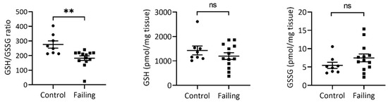 Failing hearts display a significantly reduced GSH/GSSG ratio (left). Absolute GSH levels (middle) in failing hearts are slightly reduced (not significant, p = 0.313), while GSSG content (right) is slightly increased in failing (not significant, p = 0.194). Values represent mean values and S.E.M. n (control) = 10, n (Failing hearts) = 15. ** Student t-test p-value < 0.01; ns—not significant.