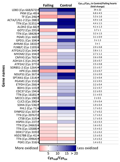 Heatmap of significantly more oxidized-cysteine residues in failing hearts. Significantly more oxidized cysteine-containing peptides p-value < 0.05, fold-change (Cysred/Cysox ratio of control versus failing heart >1.35) in failing hearts are labeled with gene names of their corresponding proteins and the cysteine position in the amino acid sequence. Colors of the map illustrate a degree of oxidation: the red color indicates lower Cysred/Cysox ratio, depicting higher degree of oxidation. On the contrary, the blue color represents higher Cysred/Cysox ratio and therefore indicates lower oxidation state of the cysteine.
