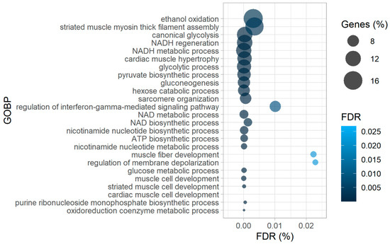 In patient samples we also detected higher oxidation of peptides matched to proteins responsible for the maintenance of contractile function in failing hearts (Figure 2), such as titin (TTN), filamin C (FLNC), LIM domain binding 3 (LDB3), and sarcoplasmic/endoplasmic reticulum calcium ATPase 2 (ATP2A2 or SERCA2). In support of these findings, the GOBP analysis of proteins more oxidized in failing hearts also resulted in enrichment of processes involved in muscle development and hypertrophy (Figure 3). Intriguingly, while redox regulation of titin has been proposed mainly for the I-band (where the spring region is located [23,24,25]), we found several significantly differentially oxidized sites from the A-band (repetitive fibronectin region), titin’s central hub for protein–protein interaction [25] in our patient dataset (Supplementary Table S4). However, it is noteworthy to mention that, although not significantly altered, we also detected a number of cysteine residues from the I-band which were more oxidized in failing hearts than controls (Supplementary Table S4).