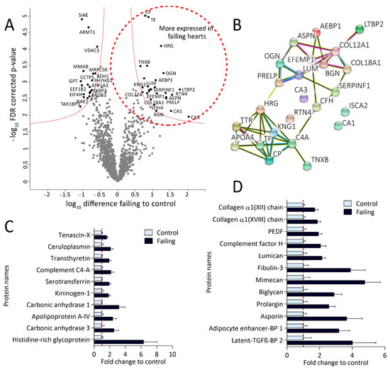 Proteomic analysis revealed altered protein expression patterns in failing hearts. (A): Volcano plot of proteins identified in failing and control hearts. Significant hits are labeled with their corresponding gene names and depicted in black. Proteins significantly more expressed in failing hearts are shown on the right while the proteins more abundant in the controls are located on the left side of the plot. (B): String protein-interaction analysis of proteins significantly more expressed in failing hearts results in two differential protein clusters (false discovery rate (FDR)-corrected p-value < 0.05, fold change (failing/control hearts) >1.5). (C): Bar plot displaying fold changes of significantly more expressed proteins from the lower String protein cluster (values normalized on the mean of the control group). (D): Bar plot representing fold changes of significantly up-regulated proteins from the upper String protein cluster, namely involved in extracellular matrix remodeling, wound healing, and fibrosis (values normalized on the mean of the control group). PEDF—pigment epithelium-derived factor (gene name: SERPINF1), BP—binding protein.