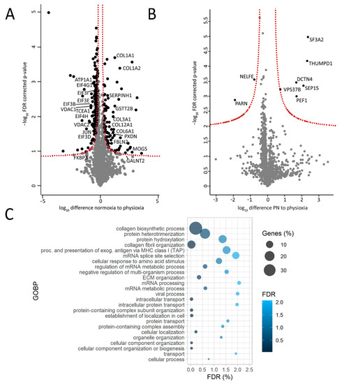 AC16 cells cultured under higher oxygen concentration (higher oxidative stress) display some similar protein signatures as failing human hearts. (A). Volcano plot of differentially expressed proteins between normoxic (N) and physioxic conditions (harvested under physioxia, PP); (B). Volcano plot of differentially expressed proteins between cells cultured in physioxia but harvested in normoxia (PN) and cells cultured and harvested under physioxia (PP). (C). Gene-ontology enrichment of biological process (GOBP) with significantly more abundant proteins in normoxia (N) compared to physioxia (PP) (proteins used for input must have passed the significance threshold of false discovery rate (FDR)-corrected p-value < 0.05 and have a fold change (compared to physioxia) >1.3). N = 3 per condition, FDR.