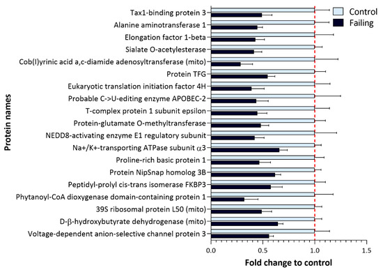 Proteins with a significantly lower expression in failing hearts compared to nonfailing control samples. Bar plot representing fold change in the expression of significantly less expressed proteins in failing hearts (Figure 4A, left side of the volcano plot) which include several metabolic enzymes as well as proteins implicated in protein translation and ion transport (FDR-corrected p-value < 0.05, fold change (failing/control hearts) <0.7).