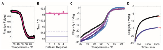 Compound induced stability experiments on fumarylacetoacetate hydrolase (FAH). (A) Typical profile for the stability screening, where the black circles correspond to the experimental data (converted to fraction folded) and the red line is the best fit to the dataset. (B) Reproducibility of the Tm values obtained by using the linear extrapolation model on the sigmoidal decays. The purple circles correspond to the experimental data, with an average value/uncertainty represented by the solid/dashed lines. Equivalent values for the reference protein (in the absence of compound) are shown in blue. (C) Thermal denaturation experiment for WT-FAH in the absence (black circles) and in the presence of increasing concentrations of the compound G1.30.B10 (light purple, 15 eq.; dark purple, 30 eq.; blue, 45 eq.). (D) Aggregation tendency of V166G-FAH over time (monitored by the ellipticity at 222 nm), in the absence (black circles) and in the presence (blue squares) of 15 eq. of G1.30.B10. The red lines correspond to the best exponential fittings to the experimental datasets.