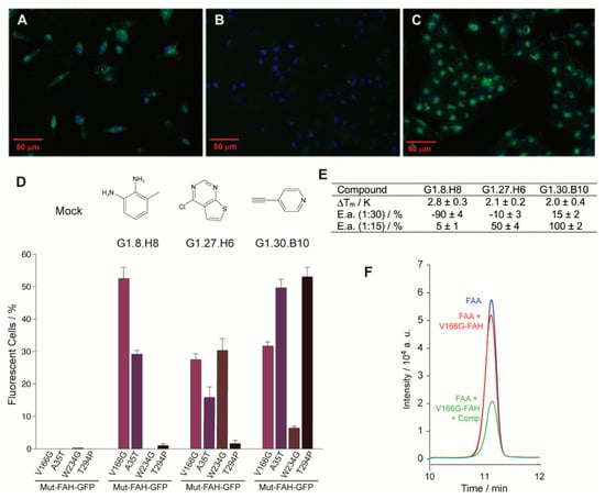 The stability assay was complemented with a functional assay. As shown previously [11], a plasmid stably expressing GFP-tagged FAH is suitable to monitor intracellular FAH homeostasis. In this context, a second in cellulo screening used human M1 cells stably expressing V166G-FAH-GFP, which were tested over the same library of 2500 fragment compounds, monitoring the GFP fluorescence by high-contrast automated fluorescent microscope [14,17,18]. V166G-FAH is particularly suitable for this experiment, since it shows no basal fluorescence, while, upon treatment with the proteasomal inhibitor MG-132, 19% of the cells become fluorescent, as determined by flow cytometry (Figure 2A). In the presence of an inactive compound, no fluorescence was observed (Figure 2B). Yet, when analyzing the entire set, 113 compounds (4.52% of the library) were found to significantly increase GFP fluorescence. Figure 2C shows a representative example of compound-induced FAH activation, with more than 80% of fluorescent cells.