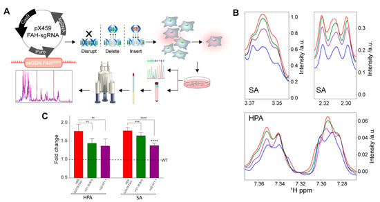 The FAH missense mutation (c.1009G > A) was introduced by targeted homologous recombination at the endogenous FAH locus in human embryonic kidney (HEK) cells. HEK293 cells were co-transfected using Lipofectamine 3000 (Thermo Fisher Scientific, Waltham MA) with the p.X459-FAH -sgRNA plasmid (2.5 µg/well) and single strand oligonucleotide (ssODN) (7.4 µg) containing the FAH-G337S mutation as well as flanking sequences on each side of the targeted exon. The pX459 plasmid was obtained from Addgene (Ref. 62988) and expresses Cas9 from S. pyogenes, puromycin resistance gene and cloning backbone for sgRNA. The targeted sequence was designed next to a NGG sequence named protospacer adjacent motif (PAM, N can be any nucleotide). Additionally, a silent substitution was introduced in the PAM sequence of the ssODN in order to prevent secondary cleavage after homology directed repair (HDR) at the FAH locus and enhance recombination efficiency. Transfected cells were cultured in DMEM supplemented with 10% fetal bovine serum (FBS) and 1% antibiotics at 37 °C and 5% CO2 for 22 h, after which media were replaced and RS-1 reagent (Sigma, Saint Louis, MO, USA) was added at 10 µM final concentration in order to stimulate HDR. Cells were incubated under the same conditions for another 5 h and then puromycin was added to media in a final concentration of 1 µg mL−1, in order to select only the transfected clones. Cells were maintained under these conditions for another 2 days, followed by a limiting dilution sub-cloning assay on 96-well plates. Completely isolated cells were progressively grown and passed to bigger dishes in order to obtain monoclonal cell lines. Genomic DNA was extracted from each of these clones and targeted exons were PCR-amplified for FAH gene sequencing to characterize genome editing at the molecular level. As HEK cells are triploid on average, the sequencing analysis is consistent with two alleles resulting from HDR modification were detected in each HEK293-FAHG337S cellular clone, while the third one remained wild type. Successfully modified clones were selected for their phenotypic characterization. Consistently, FAH-targeted clones exhibited accumulation of succynilacetone and hydroxyphenylpyruvic acid, as determined by NMR spectroscopy.