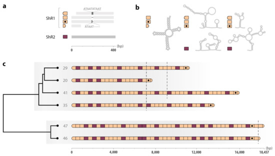 Parts of units ShR1 and ShR2 were predicted to fold into secondary DNA structures, varying from simple hairpin-loops to complex multi-branched structures (Figure 3). Notably, a 65 bp-section at the 5′-ends of ShR1s (excluding the first ShR1 unit of each genome, being incomplete at the 5′-end) assumed a tRNA-like structure (Figure 3) predicted to code for a serine. This sequence was conserved among all such ShR1 units in all six genomes, with a single nucleotide difference detected in only four of a total of 155 units.