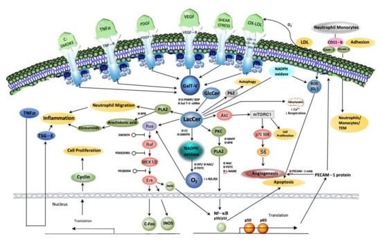 - The LacCer-centric oxidative stress pathway may increase our understanding of atherosclerosis and lupus erythematosus via downstream generation of ROS to: (a) oxidize LDL in a cyclical fashion, raising the blood levels of oxidized LDL, (b) induce cell proliferation via activating phosphokinases Akt-1 and mTOR-C1 signaling cascade, (c) regulate cell–cell adhesion involving cell adhesion molecules, ICAM-1, PECAM-1, and Mac-1 (CD11b), (d) cause shear stress induced mechano-transduction and ischemia reperfusion injury, and (e) activate the cPLA2 enzyme and PECAM-1 gene expression to induce angiogenesis required for atherosclerotic plaque survival and cancer metastasis and tumor growth in colorectal cancer and possibly other types of cancer.