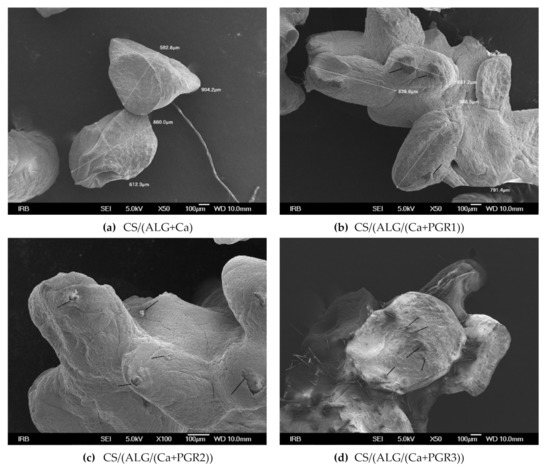 The morphology, size and shape analysis of the wet and dry microcapsules were carried out by an optical microscope (Figure 2) immediately after the preparation and scanning electron microscopy (SEM) after drying to constant mass (approximately four weeks on air at room temperature) (Figure 3). All wet microcapsules were almost spherical, but after drying to constant mass, their sphericity was lost. The analysis of wet microcapsules showed that PGR encapsulation did not have significant effect on their size which ranged from 1706.07 to 2120.64 µm, respectively (CS/(ALG/Ca) = 2053 ± 114 µm; CS/(ALG/(Ca+PGR1)) = 2120.64 ± 173.30 µm; CS/(ALG/(Ca+PGR2)) = 1706.07 ± 175.51 µm; CS/(ALG/(Ca+PGR3)) = 2104.60 ± 188.23 µm).