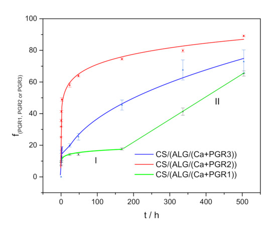 The fraction of released PGRs (f(PGR1, PGR2, or PGR3) with time from microcapsule formulations CS/(ALG/(Ca+PGR)): I—the first time interval, II—the second time interval.