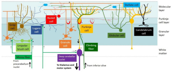 - Schilling, K.; Oberdick, J.; Rossi, F.; Baader, S.L. Besides Purkinje cells and granule neurons: An appraisal of the cell biology of the interneurons of the cerebellar cortex. Histochem. Cell Biol. 2008, 130, 601–615. [Google Scholar] [CrossRef] [PubMed]