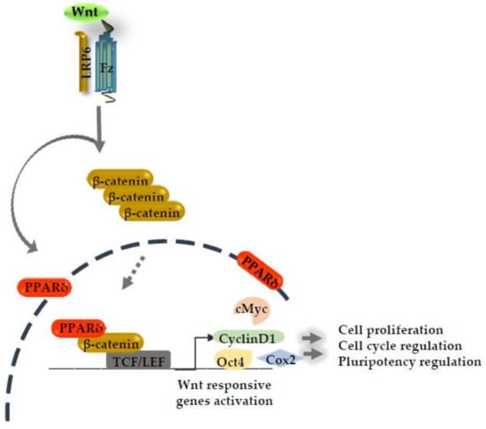 Canonical Wnt signaling activation induces the peroxisome proliferative activated receptor delta (PPARδ) expression. PPARδ synergizes with the β-catenin transcriptional activation complex in the nucleus and boosts the expression of several Wnt responsive genes.