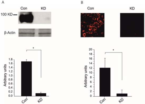 CRISPR/Cas 9 knocked down the δ-ENaC subunit in the A549. (A) Upper panel, A549 cell lysate blotted against anti δ-ENaC and β-Actin antibodies. Representative western blot out of three independent biological replicates is shown. A549 cells transfected with either CRISPR/Cas 9 control plasmid (control) or CRISPR/Cas 9 δ-ENaC KO plasmid (KD). The lower panel; mean values of quantitation of three western blots is shown. (B) Upper panel, representative confocal microscope image of anti δ-ENaC antibody, is shown. A549 cells transfected with either CRISPR/Cas 9 control plasmid (control) or CRISPR/Cas 9 δ-ENaC KO plasmid (KD). The lower panel; mean values of quantitation of 7 immunofluorescence images are shown. Significant differences are indicated, * p < 0.5, unpaired Student’s t-test, n = 5–7.