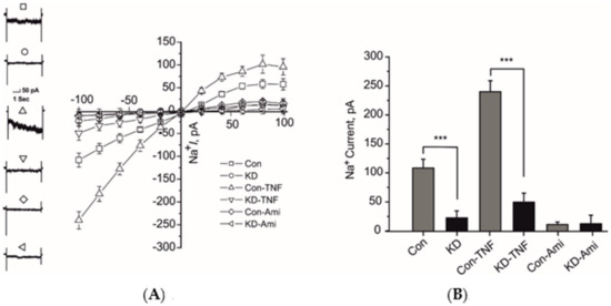 Knock down of δ-ENaC in A549 cells attenuated the tumor necrosis factor (TNF)-induced activation of ENaC. (A) Left panel, representative traces of whole-cell (10 µM) amiloride-sensitive ENaC currents at 100 mV of indicated experimental settings are shown. Right panel, IV plots of whole-cell currents of indicated experimental settings are shown. (B) Mean values of whole-cell inward sodium currents at −100 mV of indicated experimental settings are shown. Significant differences are indicated, *** p < 0.001, unpaired Student’s t-test, n = 12–15.