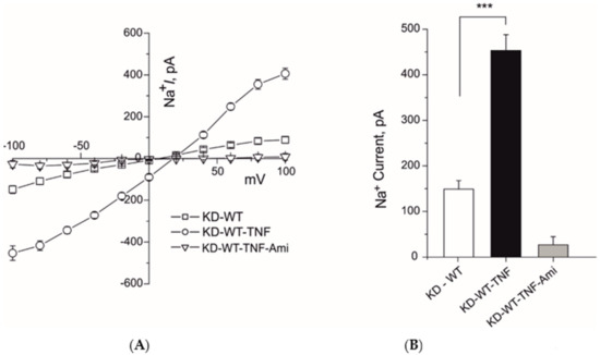 Overexpression of δ wild-type (WT) restored the TNF mediated activation of ENaC in δ-ENaC KD A549 cells. (A) left panel, IV plots of whole-cell (10 µM) amiloride-sensitive ENaC currents of indicated experimental settings are shown. (B) Mean values of whole-cell inward sodium currents at −100 mV of indicated experimental settings are shown. Significant differences are indicated, *** p < 0.001, unpaired Student’s t-test, n = 12–15.