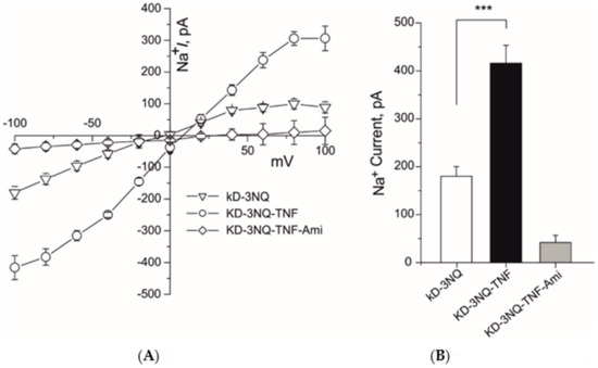 Overexpression of N-linked glycosylation sites mutated δ-ENaC (3NQ) restored the TNF mediated activation of ENaC in δ-ENaC KD A549 cells. (A) IV plots of whole-cell (10 µM) amiloride-sensitive ENaC currents of indicated experimental settings are shown. (B) Mean values of whole-cell inward sodium currents at −100 mV of indicated experimental settings are shown. Significant differences are indicated, *** p < 0.001, unpaired Student’s t-test, n = 12–15.