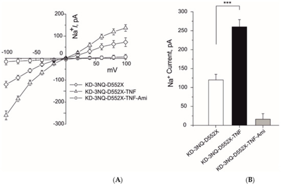 Overexpression of N-linked glycosylation sites mutated and carboxyl terminal dele δ-ENaC (3NQ-D522X) restored the TNF mediated activation of ENaC in δ-ENaC KD A549 cells. (A) IV plots of whole-cell (10 µM) amiloride-sensitive ENaC currents of indicated experimental settings are shown. (B) Mean values of whole-cell inward sodium currents at −100 mV of indicated experimental settings are shown. Significant differences are indicated, *** p < 0.001, unpaired Student’s t-test, n = 9–11.