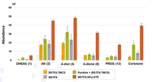 - Bowden, J.A.; Colosi, D.M.; Mora-Montero, D.C.; Garrett, T.J.; Yost, R.A. Enhancement of chemical derivatization of steroids by gas chromatography/mass spectrometry (GC/MS). J. Chromatogr. B Anal. Technol. Biomed. Life Sci. 2009, 877, 3237–3242. [Google Scholar] [CrossRef]