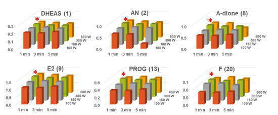 - Casals, G.; Marcos, J.; Pozo, O.J.; Alcaraz, J.; Martínez de Osaba, M.J.; Jiménez, W. Microwave-assisted derivatization: Application to steroid profiling by gas chromatography/mass spectrometry. J. Chromatogr. B Anal. Technol. Biomed. Life Sci. 2014, 960, 8–13. [Google Scholar] [CrossRef] [PubMed]