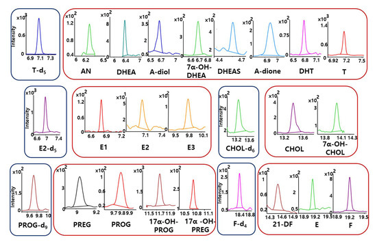 - Moon, J.-Y.; Lee, H.S.; Kim, J.H.; Lee, J.H.; Choi, M.H. Supported liquid extraction coupled to gas chromatography-selective mass spectrometric scan modes for serum steroid profiling. Anal. Chim. Acta 2018, 1037, 281–292. [Google Scholar] [CrossRef]