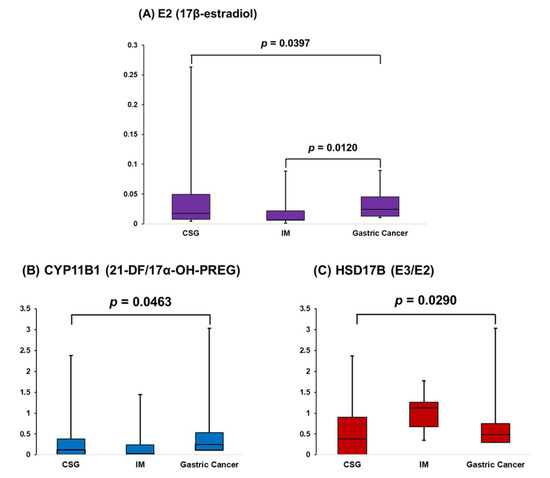 - Frycz, B.A.; Murawa, D.; Borejsza-Wysocki, M.; Marciniak, R.; Murawa, P.; Drews, M.; Jagodziński, P.P. Expression of 17β-hydroxysteroid dehydrogenase type 2 is associated with some clinicopathological features in gastric cancer. Biomed. Pharm. 2015, 70, 24–27. [Google Scholar] [CrossRef] [PubMed]