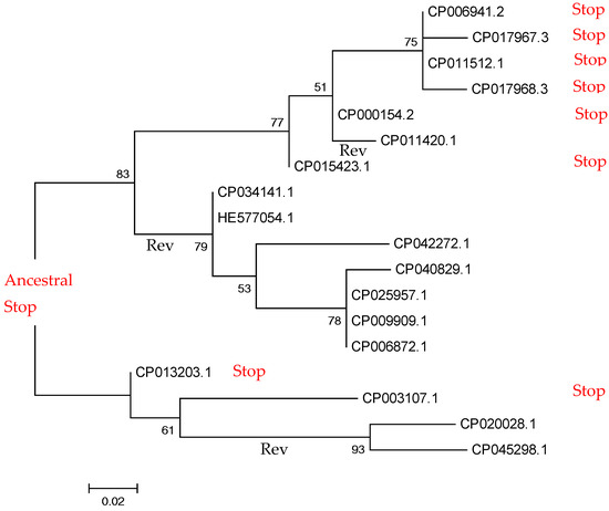 Molecular phylogenetic analysis by maximum-likelihood method. The tree with the highest log likelihood (−247.8) is shown. “Stop” indicated TAG codons, unmarked terminal branches contain “CAG” in the orthologous positions (Figure 1). “Rev” under corresponding branches indicates TAG > CAG substitutions. The bootstrap support values are shown next to the branches; the scale bar indicates the number of substitutions per site. The list of genomes is shown in Supplementary Table S1. The nearly perfect correspondence of the reconstructed (the current figure) tree and the species tree (Figure 2 in [26]) is a well-known property of the vertically inherited sequences [27] and suggests the absence of horizontal gene transfer events in the set of studied sequences (Figure 1).
