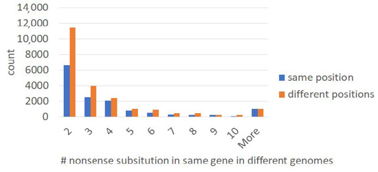 In general, the results of small- and large-scale analyses are consistent. According to the large-scale experiment, a vast majority of detected orthologous stop codons tend to exist for a short period of time (roughly corresponding to SNPs). Analyses of dN/dS (Table 1) are consistent with this time estimate. The accelerated evolution of some double mutations with an intermediate in-frame stop codon (Figure 6) reflects potential avoidance of in-frame stop codons for prolonged period of times. Indeed, the small-scale analysis was designed to study fixed mutations at the level of different species rather than SNPs [31,32,33]. Overall, our results suggest that in-frame stop codons and readthrough events (suppression of in-frame stop codons) are likely to be widespread biological phenomena in prokaryotes, and such stop codons could be advantageous for short periods of time.