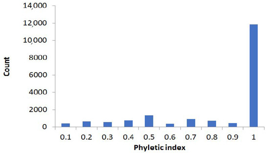 Analysis of ATGC-COG functional categories did not reveal any major trends, except for an over-representation of the [X} “Mobilome: phages and transposons” (Supplementary Table S2) (9889 cases in total). It should be noted that the total number of cases of the next two most abundant categories ([G] “Carbohydrate transport and metabolism” [6126 cases] and [R] “General function prediction only” [5516 cases]) is substantially greater than the [X] functional category (12,713 vs. 9889) (Supplementary Table S2).