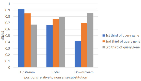 Frameshift mutations in protein-coding genes are caused by sequencing errors or programmed ribosomal frameshifting. Programmed ribosomal frameshift events are rare, but they are functionally important [62,63]. We avoided frameshift mutations by using the window (±30 nucleotides) surrounding in-frame stop codons. Even if frameshifts are present in our dataset, it will cause a false “positive selection” (dN/dS > 1), because the third position of affected codons (this position is known to be the most variable position) shifts to the first or second positions (these positions are known to be the most conserved positions) [30]. Thus, this can bias our estimates of dN/dS because dN values become artificially large and dS values become artificially small [64,65]. We observed the opposite trend (dN/dS < 1, Table 1 and Figure 5). Thus, frameshift mutations are not likely to affect our results and conclusions.