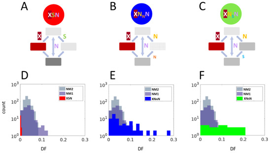 Types and distribution of double fraction (DF) relative to controls. (A) Double-substitutions XSN, in which a single substitution can be either synonymous or nonsense, while the double substitution is nonsynonymous, as compared to the ancestral state. (B) Double-substitution XNNN, in which a single substitution can be either nonsynonymous or nonsense, while the double substitution is nonsynonymous to the ancestral state, and the substitution between the intermediate nonsynonymous to the final nonsynonymous is nonsynonymous, as well. (C) Double-substitution XNSN, in which a single substitution can be either nonsynonymous or nonsense, while the double substitution is nonsynonymous to the ancestral state; however, the intermediate state is synonymous to the final state. (D) Distribution of DF values of XSN double substitution, compared to NM1 (syn_31) and NM2 (syn_33) control null models. (E) Distribution of DF values of XNNN double substitution, compared to NM1 and NM2 control null models. (F) Distribution of DF values of XNSN double substitution, compared to NM1 and NM2 control null models.