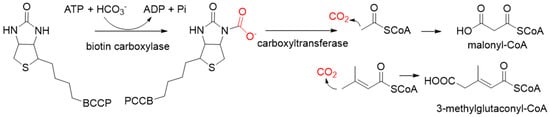 Biotin-dependent carboxylases include pyruvate carboxylase (PC, EC 6.4.1.1), acetyl-CoA carboxylase (ACC, EC 6.4.1.2), propionyl-CoA carboxylase (PCC, EC 6.4.1.3), 3-methylcrotonoyl-CoA carboxylase (MCC, EC 6.4.1.4), and geranoyl-CoA carboxylase (GCC, EC 6.4.1.5). They are widely distributed in nature and can be found in archaea, bacteria, algae, fungi, plants, and animals [32]. The catalytic process of biotin-dependent carboxylases can be divided into two steps (Figure 2). First, the biotin carboxylase (BC) domain catalyzes the ATP-dependent carboxylation of the N1′ atom of the biotin cofactor, using bicarbonate as the CO2 donor. Second, the carboxyltransferase (CT) domain transfers the CO2 from carboxy-biotin to the substrates [33,34,35]. The site for carboxylation is on the α-carbon of saturated substrates (pyruvate, acetyl-CoA, and propionyl-CoA) or the γ-carbon of α, β-unsaturated substrates (3-methylcrotonyl-CoA, geranyl-CoA). Acetyl-CoA carboxylase and propionyl-CoA carboxylase are two carboxylases of 3-hydroxypropionate/malyl-CoA cycle and 3-hydroxypropionate/4-hydroxybutyrate cycle [36,37].