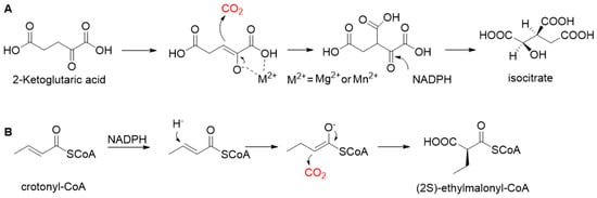 Pyruvate synthase (PS, EC 1.2.7.1) and 2-oxoglutarate synthase (OGS, EC 1.2.7.3) are a class of enzymes sharing a similar catalytic mechanism [41,42]. They belong to strictly anaerobic enzymes and show low catalytic activity. Acetyl-CoA can be reductively carboxylated by pyruvate synthase at the expense of two equivalents of ferredoxin to generate pyruvate. Similarly, succinyl-CoA can be converted to 2-oxoglutarate by 2-oxoglutarate synthase [43]. Different from the above two enzymes, isocitrate dehydrogenase (IDH, EC 1.1.1.41/42) converts 2-oxoglutarate to isocitrate at the expense of NAD(P)H [44]. The carboxylation process of isocitrate dehydrogenase is assumed to proceed via the enolate intermediate of 2-oxoglutarate, which is formed with the assistance of divalent metal ions Mg2+ or Mn2+. After the addition of CO2, the unstable keto-tricarboxylic acid intermediate is immediately reduced by NAD(P)H to yield stable isocitrate (Figure 3A). 2-oxoglutarate synthase and isocitrate dehydrogenase are carboxylases of the reductive tricarboxylic acid (rTCA) cycle.