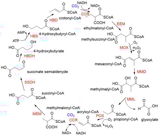The crotonyl-CoA/ethylmalonyl-CoA/hydroxybutyryl-CoA cycle pathway (CETCH pathway) [21]. CCR, crotonyl-CoA carboxylase/reductase; EEM, ethylmalonyl-CoA epimerase, and mutase; MOX, methylsuccinyl-CoA oxidase; MMD, methylmalyl-CoA dehydratase; MML, methylmalyl-CoA lyase; POX, propionyl-CoA oxidase; MEM, methylmalonyl-CoA epimerase, and mutase; SSDH, succinate semialdehyde dehydrogenase; HBDH, 4-hydroxybutyrate dehydrogenase; HBS, 4-hydroxybutyryl-CoA synthetase; HBD, 4-hydroxybutyryl-CoA dehydratase.