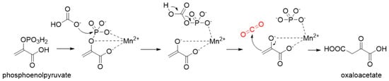Phosphoenolpyruvate (PEP) carboxylase (PEPC, EC 4.1.1.31) catalyzes the irreversible carboxylation of PEP to form oxaloacetate (OAA) using Mg2+ or Mn2+ as a cofactor [50]. This kind of enzyme is present in most photosynthetic organisms [51]. PEPC is used to replenish intermediates of the TCA cycle for amino acid biosynthesis, or to shuttle CO2 between the mesophyll and bundle sheath cells in C4 plants. The catalytic mechanism of PEPC has been well studied (Figure 5). First, bicarbonate act as a nucleophile to attack phosphate groups in PEP, yielding carboxyphosphate and enolates of pyruvate, which is stabilized by metal ions Mn2+. Next, carboxyphosphate decomposes into inorganic phosphate and CO2, which is attacked by enolates of pyruvate to form OAA [52].