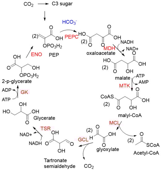 PEPC is known to be one of the most active carboxylases (Kcat/Km = 23,792 s−1 mM−1) [53]. Based on PEPC, Hong Yu et al. constructed a synthetic malyl-CoA-glycerate (MCG) pathway [19], which is capable of converting one C3 sugar to two acetyl-CoA via fixation of one CO2 equivalent, or assimilating glyoxylate, a photorespiration intermediate, to produce acetyl-CoA without carbon loss (Figure 6). Coupling the MCG pathway with the CBB cycle, photosynthetic organisms utilize only 5.5 ATP and 1.5 Rubisco turnovers to produce one acetyl-CoA from CO2 equivalents, while the native pathway requires 7 ATP and 3 Rubisco turnovers. When transferring the MCG pathway into a photosynthetic organism Synechococcus elongates PCC7942, the intracellular acetyl-CoA level increased, and bicarbonate assimilation was improved by roughly 2-fold.