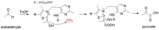 Pyruvate decarboxylase (PDC, EC 4.1.1.1) is a key enzyme of carbon metabolism at the branching point between aerobic respiration and anaerobic alcoholic fermentation, and can be found in some bacteria, yeasts, and plants [54]. PDC catalyzes the decarboxylation of pyruvate by using ThDP and Mg2+ as cofactors (Figure 7). This enzyme has been successfully applied to yield pyruvic acid through the reverse carboxylation reaction. To favor the carboxylation, high pH and high bicarbonate concentration are needed [55]. In addition to using a high concentration of bicarbonate solution as a CO2 source, elevated CO2 pressure is also an effective way to drive the direction of carboxylation. Combining branched-chain α-keto acid decarboxylase (KdcA) from Lactococcus lactis with transaminase or amino acid dehydrogenase, Julia Martin et al. achieved the synthesis of L-methionine from the abundant industrial intermediate methional under a 2 bar CO2 atmosphere [56].