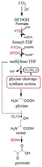 The reductive glycine pathway (RGP) [61]. FTS, formyl-THF synthase; FTCH, formyl-THF cyclohydrolase; MTDH, methylene-THF dehydrogenase; GLYA, L-serine hydroxymethyltransferase; SDAA, L-serine dehydratase.
