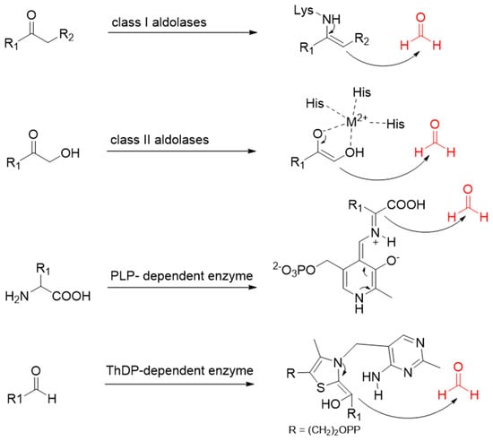 Formaldehyde is a cytotoxic compound and a central metabolic intermediate in methylotrophs [66]. In addition to the naturally occurring formaldehyde condensing enzymes, such as dihydroxyacetone synthase (DAS), 3-hexulose-6-phosphate synthase (HPS), and serine hydroxymethyltransferase (SHMT), several promiscuous enzymes display catalytic activity towards formaldehyde. Based on the catalytic mechanism, those enzymes can be divided into 4 categories (Figure 9). Class I aldolases activate the donor substrate with a lysine residue. Class II aldolases use a metal cofactor to facilitate the activation of donor substrate to an enolate. The third class is hydroxymethyl pyridoxal 5′-phosphate (PLP) dependent enzymes. The PLP coenzyme activates the donor substrate to form a quinoide-aldimine intermediate. The last is ThDP-dependent enzymes. The ThDP coenzyme activates the donor substrate to form an enamine/carbanion intermediate. For the first three classes of enzymes, formaldehyde cannot act as a donor substrate because it is not enolizable. For ThDP-dependent enzymes, formaldehyde can act either as a donor or an acceptor. C-C ligases using formaldehyde as a donor or acceptor were summarized in Table 2. Furthermore, the formaldehyde assimilation pathways published in recent years are highlighted.