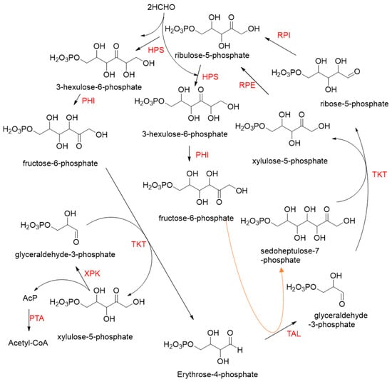 The methanol condensation cycle (MCC) [70]. HPS, hexulose phosphate synthase; PHI, phosphohexulose isomerase; TAL, transaldolase; TKT, transketolase; RPE, D-ribulose 5-phosphate epimerase; RPI, Ribose-5-phosphate isomerase; XPK, phosphoketolase; PTA, phosphate acetyltransferase.