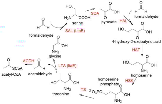 The homoserine cycle [74]. SAL, serine aldolase; SDA, serine deaminase; HAL, 4-hydroxy-2-oxobutanoate (HOB) aldolase; HAT, HOB aminotransferase; HSK, homoserine kinase; TS, threonine synthase; LTA, threonine aldolase; ACDH, acetylating acetaldehyde dehydrogenase. Both SAL and LTA are catalyzed by the same LtaE enzyme.