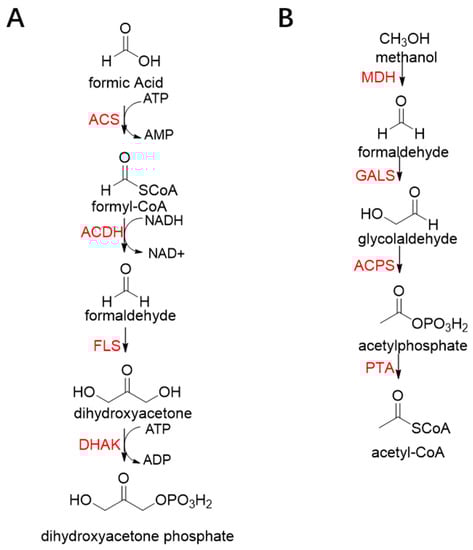 The formolase (FLS) pathway [22] and synthetic acetyl-CoA (SACA) pathway [23]. (A) The formolase (FLS) pathway. ACS, acetyl-CoA synthase; ACDH, acetaldehyde dehydrogenase; FLS, formolase; DHAK, dihydroxyacetone kinase. (B) The synthetic acetyl-CoA (SACA) pathway. GALS, glycolaldehyde synthase; ACPS, acetyl-phosphate synthase; PTA, phosphate acetyltransferase.