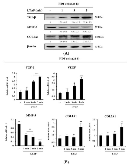 LTAP regulates proliferating and aging factors in human dermal fibroblasts (HDFs). HDFs were exposed to LTAP for 1, 3, or 5 min, and further incubated for 24 h. (A) Expression levels of transforming growth factor-β (TGF-β), matrix metallopeptidase-3 (MMP-3), and collagen type I alpha 1 (COL1A1) were analyzed by Western blotting. β-actin was used as a loading control. Numerical values on the blots represent DU. The control was normalized to 1 DU. All data represent three independent experiments. (B) mRNA expression analysis for TGF-β, vascular endothelial growth factor (VEGF), MMP-3, COL1A1, and COL3A1 was performed by qRT-PCR. Data represent three independent experiments and are the means ± SD. * p < 0.05, ** p < 0.01, *** p < 0.001 (control vs. LTAP-exposed cells).