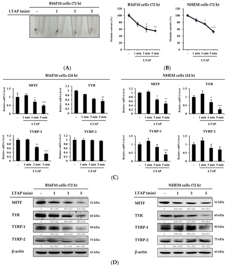 To understand the effect of LTAP on melanogenesis, we exposed B16F10 cells and NHEMs to LTAP for 1, 3, or 5 min. Our results showed that the melanin content in B16F10 cells was significantly decreased on LTAP exposure (Figure 5A,B). The main factors that produce melanin are microphthalmia-associated transcription factor (MITF), tyrosinase (TYR), and tyrosinase-related proteins-1, 2 (TYRP-1, TYRP-2) [20]. Here, we found that LTAP exposure significantly decreased the expression levels of MITF, TYR and TYRP-1, but not TYRP-2, in both B16F10 cells and NHEMs (Figure 5C). Furthermore, the melanin-producing factors other than TYRP-2 were significantly reduced at the protein level in cells exposed for 5 min compared with cells exposed for 1 or 3 min in both B16F10 cells and NHEMs (Figure 5D).