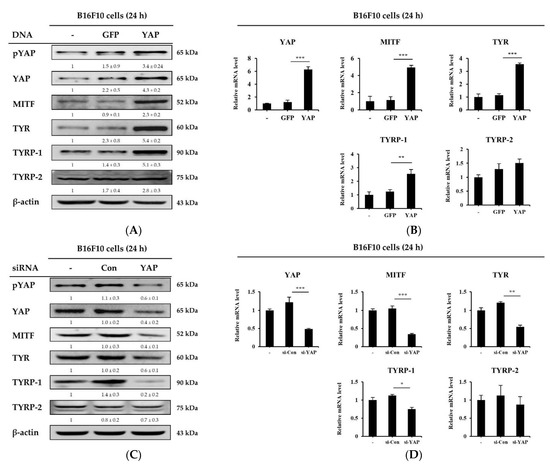 Melanogenesis-related molecules are mediated by YAP. (A,B) B16F10 cells were transfected with a plasmid overexpressing either GFP (a control) or YAP, and incubated for a further 24 h. (A) pYAP, YAP, MITF, TYR, and TYRP-1, 2 levels were evaluated by Western blotting. β-actin was used as a loading control. (B) YAP, MITF, TYR and TYRP-1, 2 expression levels were determined by qRT-PCR. (C,D) B16F10 cells were transfected with either control siRNA or YAP siRNA, and incubated for 24 h. (C) pYAP, YAP, MITF, TYR, TYRP-1, 2 and β-actin were determined by Western blotting, and (D) YAP, MITF, TYR and TYRP-1, 2 expression levels were analyzed by qRT-PCR. Data represent three independent experiments (means ± SD). * p < 0.05, ** p < 0.01, *** p < 0.001. Numerical values on the blots represent DU. The control was normalized to 1 DU.