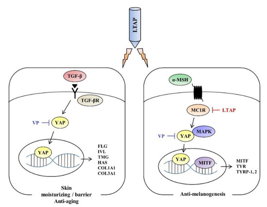 As mentioned above, YAP maintains skin homeostasis and regulates various types of cancer cells; the antitumor activity of VP has been reported in numerous studies [37,38,39,40]. Among them, malignant melanoma is the most fatal skin cancer, with a high risk of metastasis. There is evidence that YAP contributes to maintaining the transforming phenotype of melanoma cells [41,42], and VP contributes to the inhibition of melanoma cell proliferation [19,43]. However, little is known about the mechanism by which YAP regulates melanoma function. Here, we investigated the effects of LTAP exposure on YAP expression and anti-melanogenesis in B16F10 cells and NHEMs. LTAP exposure significantly inhibited mRNA and protein levels of the factors involved in anti-melanogenesis (MITF, TYR, and TYRP-1). However, it did not affect the expression level of TYRP-2 (Figure 5).